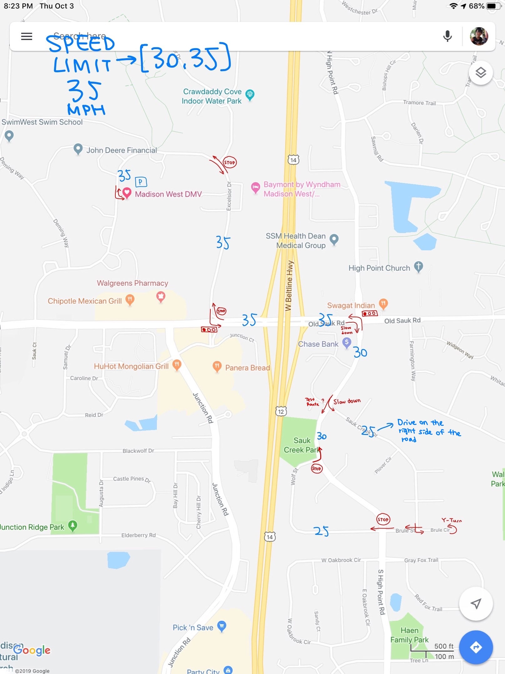 And here is the usual test route for line 1. Line 2 has a few variations in the residential area, but it should not be too big of an issue. Try to memorize the speed limits of certain road sections before the exam: 35 miles/hr for "big roads", 25 miles/hr for residential areas, and a 30 miles/hr section in the middle. Use Google Map street view for reference.